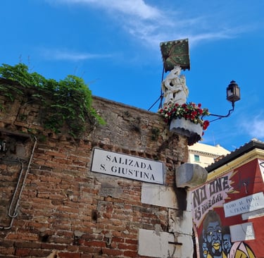 On retourne sur la calle del Campaniel, qui se prolonge légèrement sur la droite par la calle delle vida, puis la calle dell’olio… On prend à droite la salizzada San Francesco… Puis à gauche la salizzada san Giustina… Puis encore à gauche la calle Zorzi...