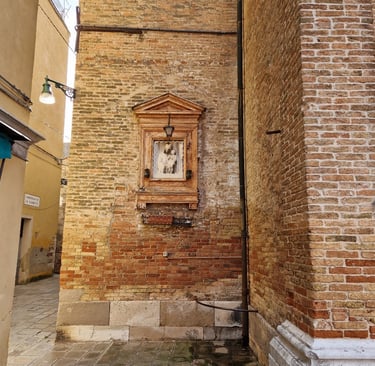 Pour les Vénitiens, c'est une petite chapelle et la pierre rouge se trouve au pied de celle-ci, car en passant devant le tableau de la Vierge, la peste tomba inerte sur le sol...