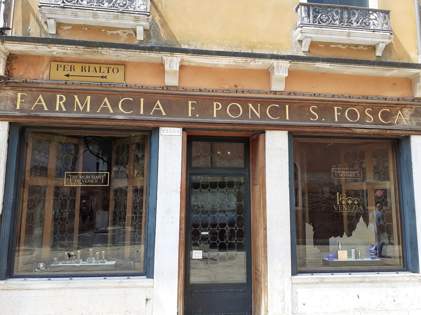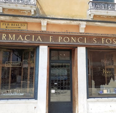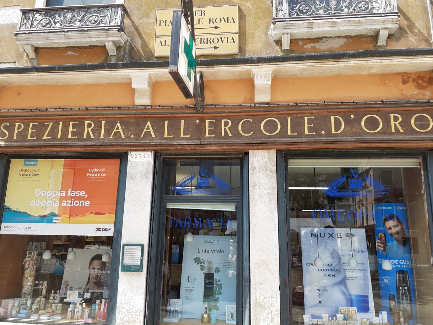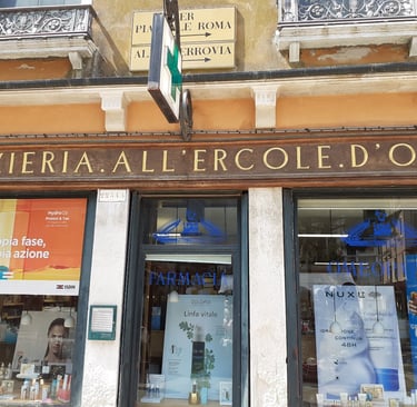 Tout n’est pas intéressant dans cette rue… Mais je veux te montrer, du côté droit, une pharmacie antique : la farmacia all’Ercole d’Oro, qui date du XVIIIème siècle…