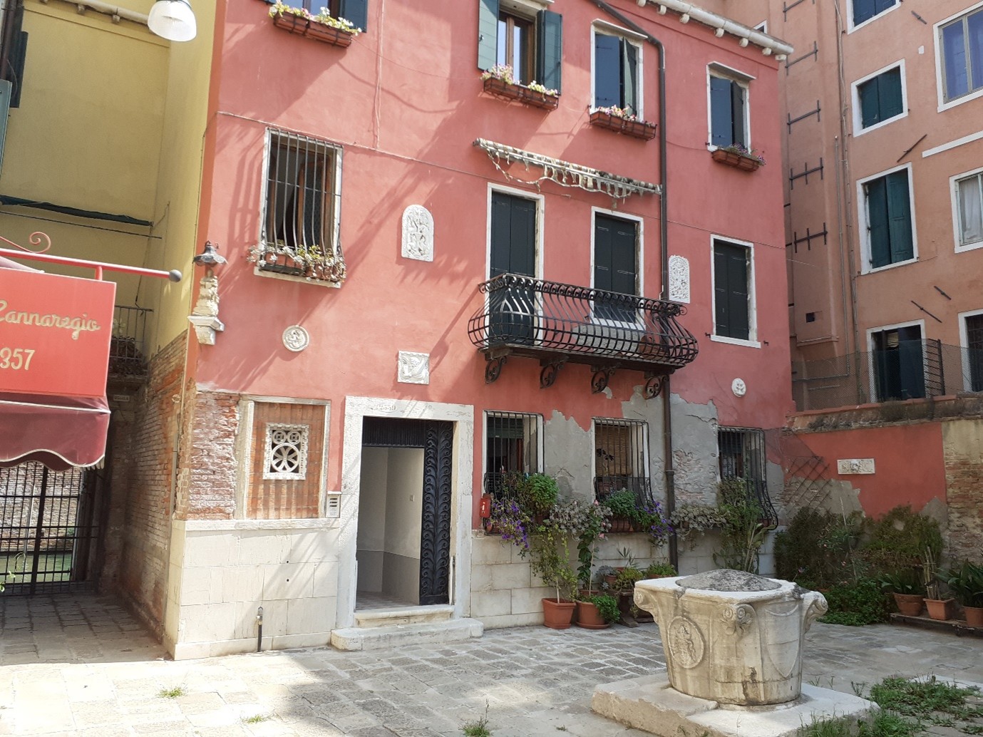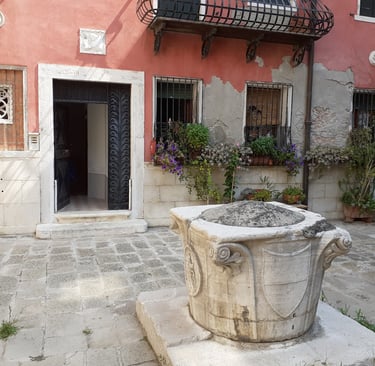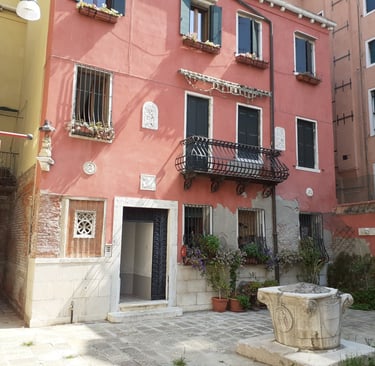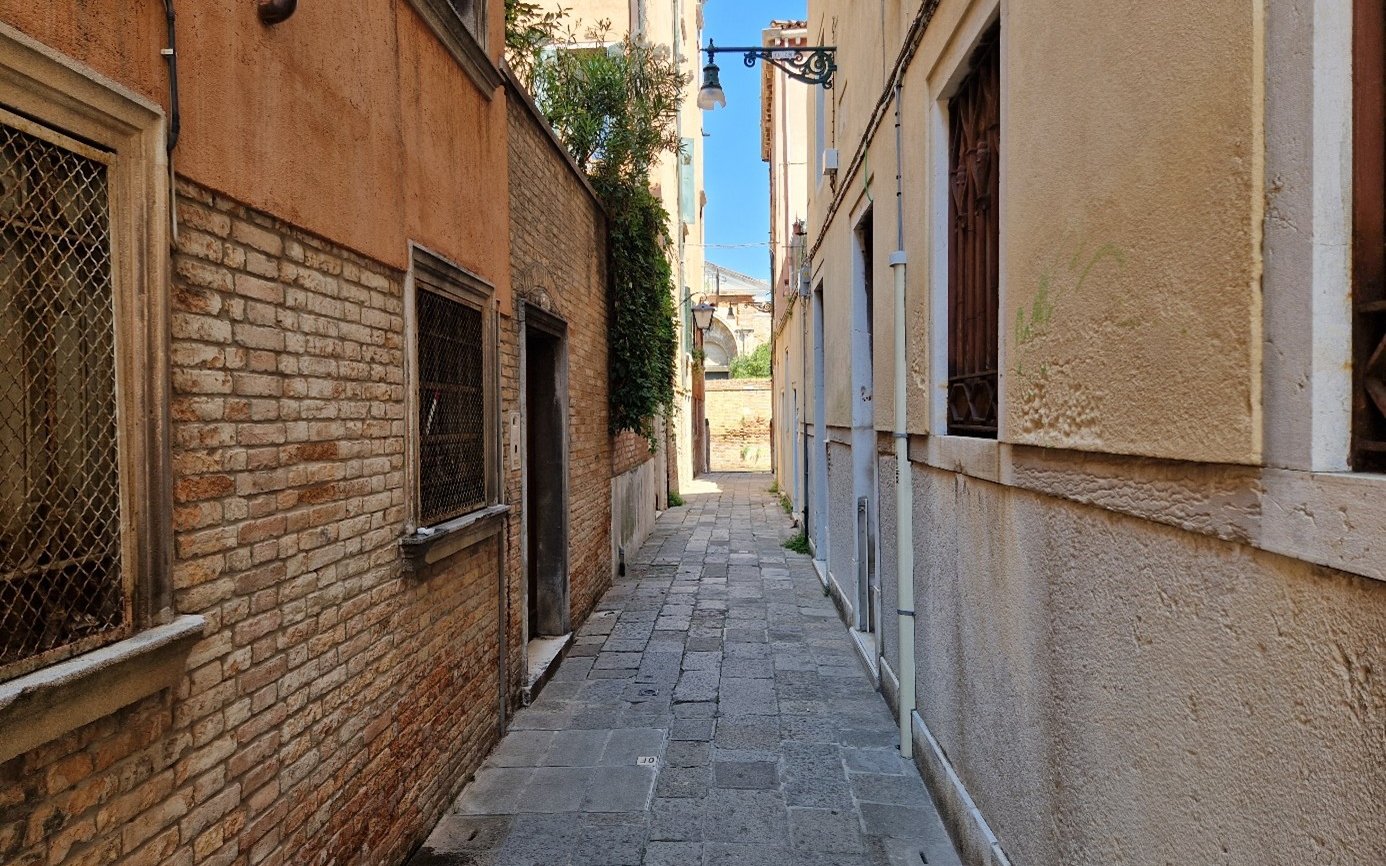 Oui, le rio terra della Maddalena serait d’ailleurs la première ruelle à avoir été construite sur un canal enterré. C’était en 1398. On va prendre à gauche, sous le sottoportego, la calle larga Vendramin… qui nous conduit au campiello Vendramin sur lequel donne l’arrière de la Cà Vendramin Calergi, le palais où mourut Richard Wagner en 1883, qui est maintenant un Casino municipal. On peut voir une belle vera da pozzo dans la cour…. On va maintenant passer par le campiello Colombina juste à côté… puis la calle Colombina… qui va nous permettre de rejoindre le rio terra della Maddalena…