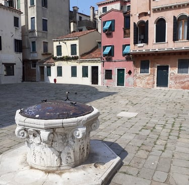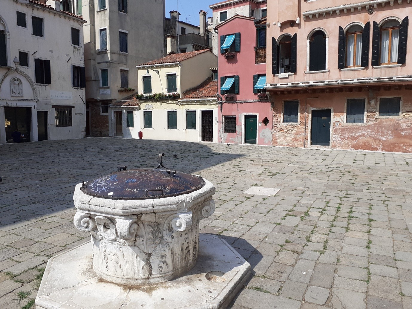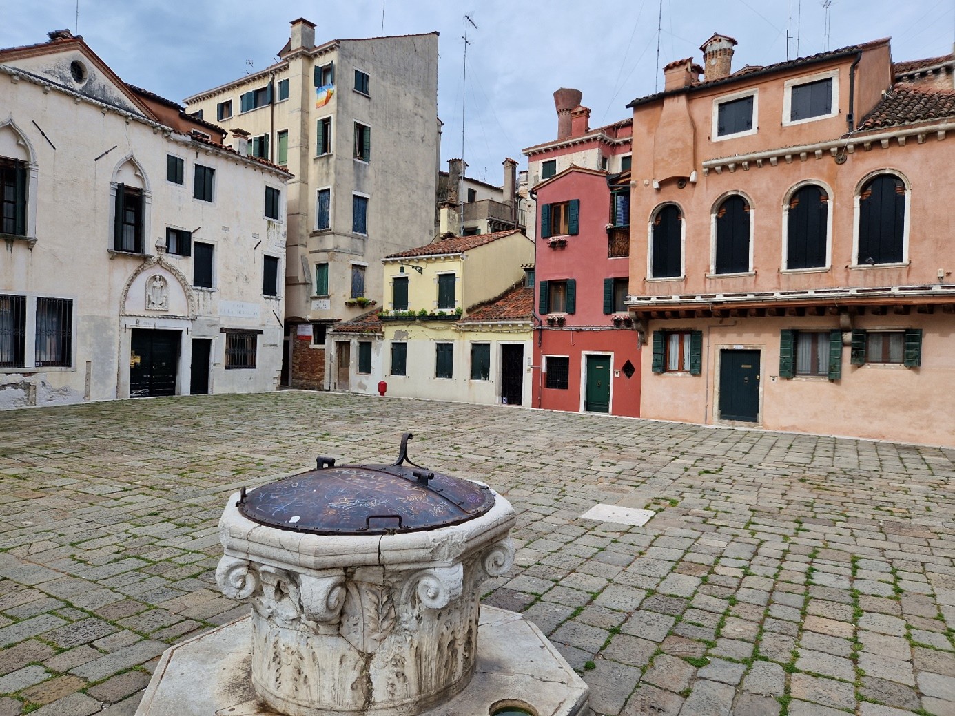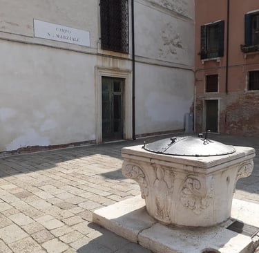 En effet ! Une margelle de puits dans le style Renaissance…. On va maintenant prendre la calle de la Maddalena à droite de l’église…. Cette calle nous conduit à la corte Erizzo… dans cette cour, se trouve le palais Marcello, qui date du XVIIème siècle…. On va voir une autre cour : par le ramo Erizzo… puis la calle Erizzo… on prend à gauche sur la calle longa Vendramin… puis à droite la calle del Cristo… puis à, gauche le ramo del Cristo pour rejoindre le rio terra della Maddalena. Il n’y avait pas grand-chose à voir mais ça nous a permis de faire une petite promenade tranquille avant de nous retrouver sur une des rues les plus fréquentées de Venise.