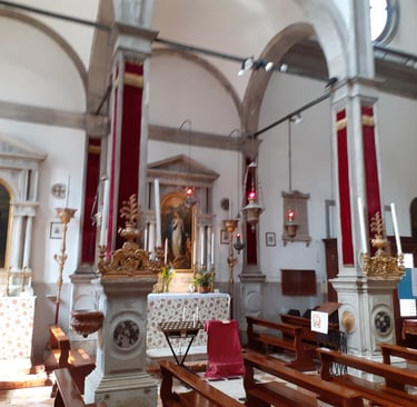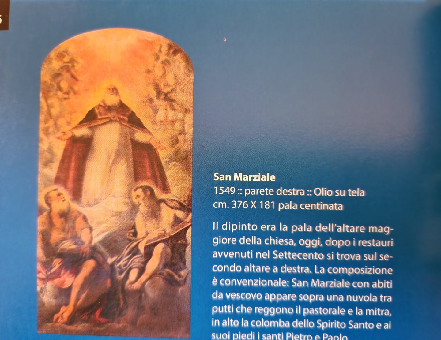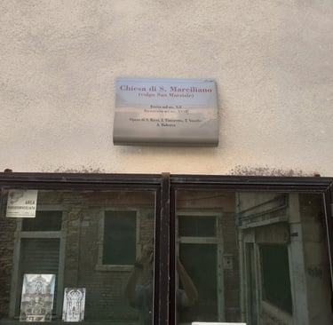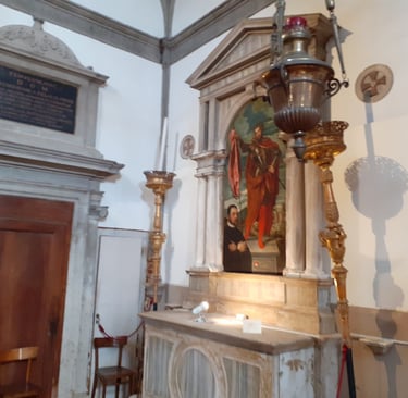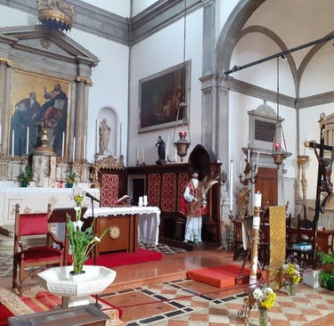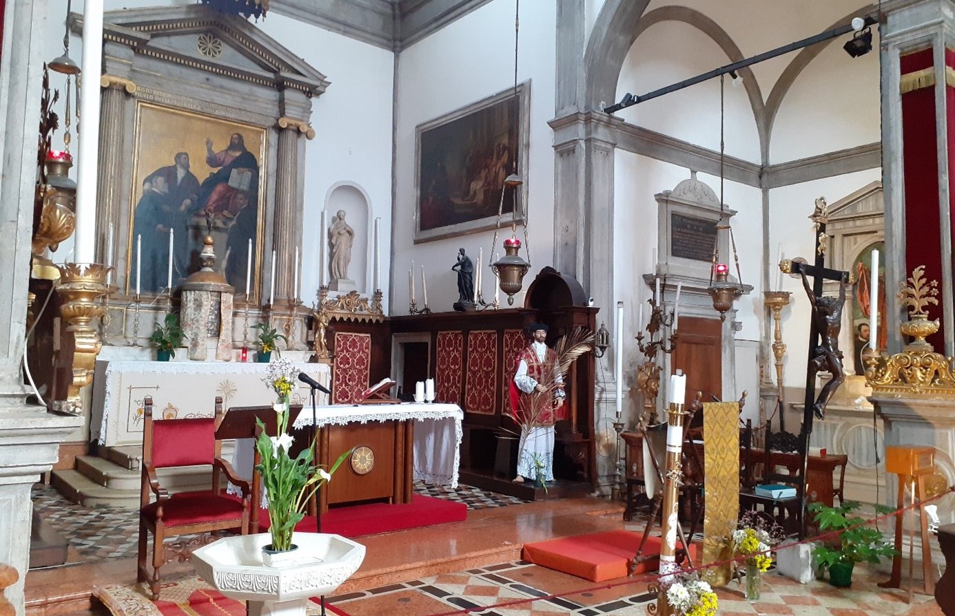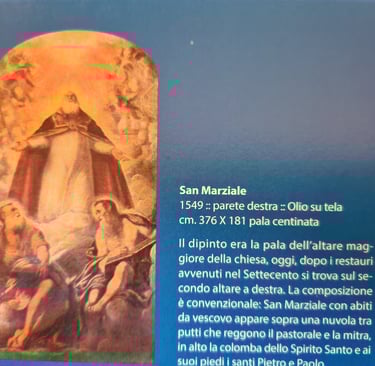 Le retable du Tintoret se trouve sur le second autel à droite. Il représente San Marziale, Saint Martial, plutôt puisqu'il était français. C'était l'évêque de Limoges. Il fut un des évêques envoyés de Rome pour évangéliser la Gaule, au IIIème siècle. Le jour de la fête de Saint Martial, qui tombe le 30 juin, est spécialement fêté à Venise depuis 1373 car ce jour-là, l’armée de Venise remporta trois batailles importantes : à Zadar (qui se trouve aujourd’hui en Croatie mais qui fut vénitienne de 1202 à 1358 et de 1409 à 1797) ; une autre dans les Balkans contre les Turcs et la troisième contre les Padouans….