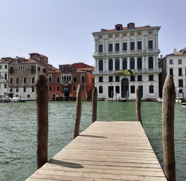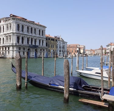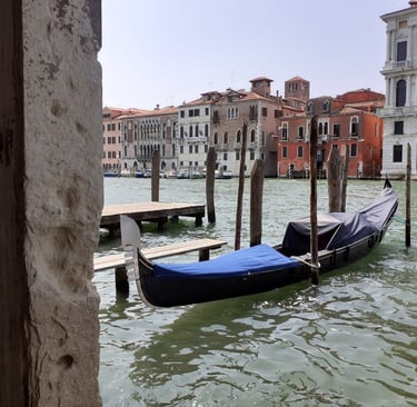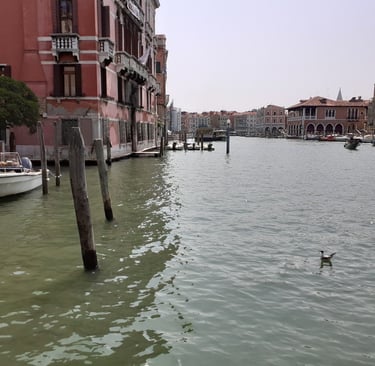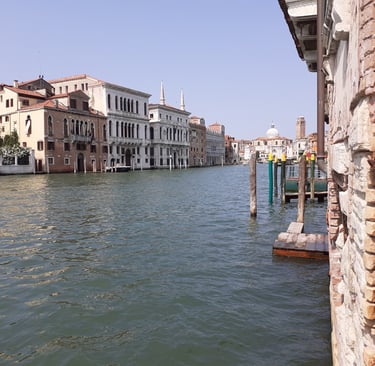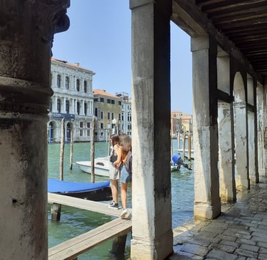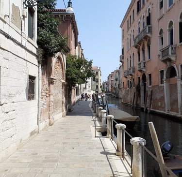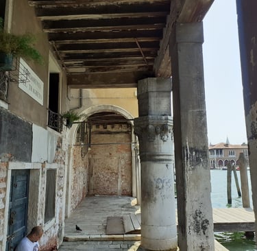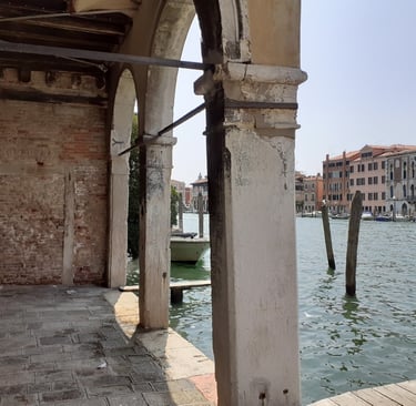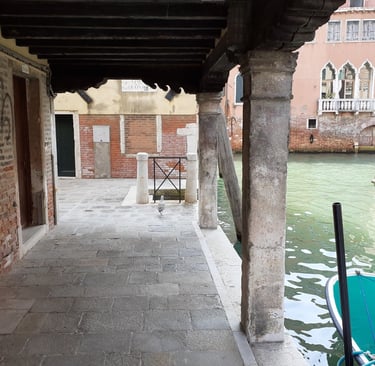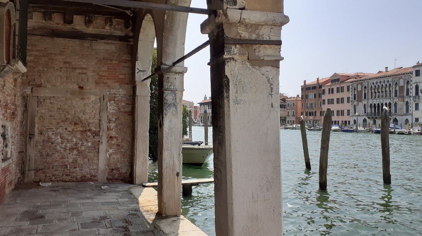 On va maintenant prendre la calle del Traghetto en face de l’église… Elle nous conduit au bord du Grand Canal, sous un portique… On pourra aussi s’avancer un peu…